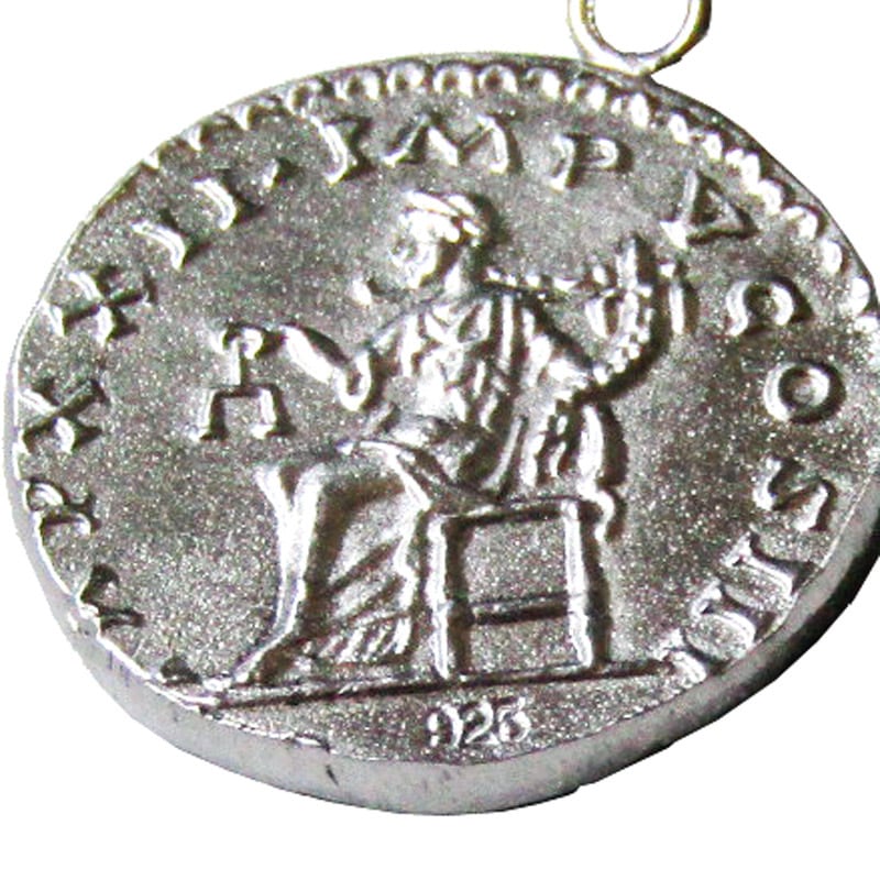 古代ローマの歴史を感じさせる、シルバー925製のコインネックレスです!このネックレスには、五賢帝の最後の皇帝であるマルクス=アウレリウス=アントニヌス帝のレプリカコインがあしらわれています。コインデザインには、彼の偉大な治世(帝位 161-180年)を象徴する要素が満載で、歴史好きな方にはたまらない一品となっています。