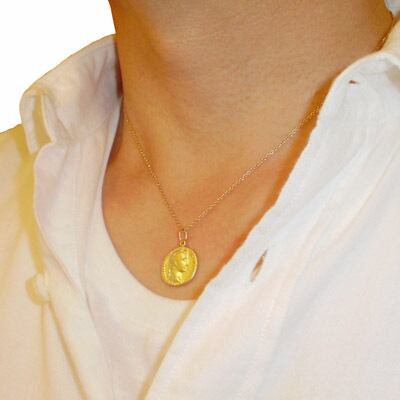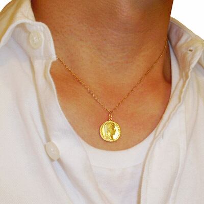 K10ゴールドを使用した古代ローマ帝国のアウグストウス帝コインをモチーフにしたペンダントです。このペンダントは、歴史的な魅力を持つデザインとなっており、特別な存在感を演出します。男女兼用で、男性が身に着けても体格負けしない大きさで、エレガントかつ力強い印象を与えます。