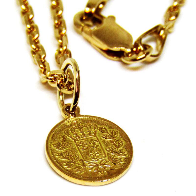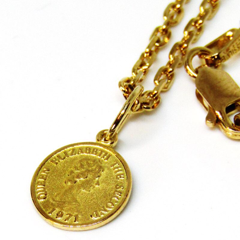 K10ゴールドを使用したエリザベスコインをモチーフにしたペンダントです。この小ぶりながらも厚みのある作りのペンダントは、両面に刻印が施されており、特別な存在感を放っています。シルバー925の18金コーティングチェーンが付属しており、エレガントな仕上がりです。カジュアルなおしゃれにはもちろん、フォーマルなシーンでも活躍するアイテムです。